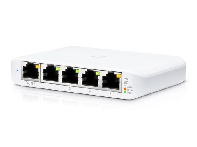 O Switch Ubiquiti UniFi Gen2 5P USW-Flex-Mini é um switch gerenciável de camada 2 com 5 portas Gigabit Ethernet RJ-45, sendo 1 porta de entrada PoE 802.3af. O USW Flex Mini pode ser alimentado através de PoE (na porta 1) ou através da fonte USB-C que acompanha o produto. O switch também pode ser monitorado e configurado de qualquer lugar através da interface intuitiva da aplicação UniFi Network, disponível via web ou app móvel.